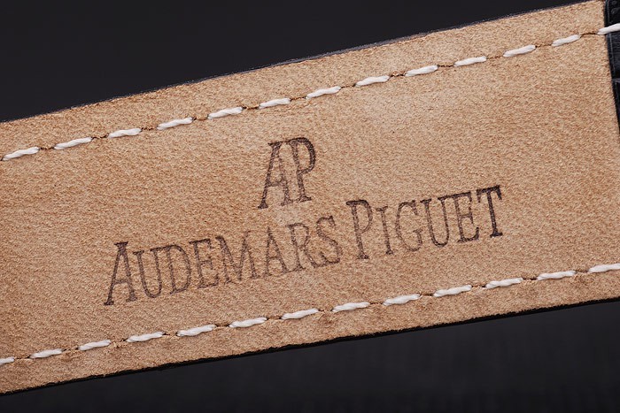 Bracelet: Bracelet en cuir de crocodile avec coutures blanches et de la chaleur en relief Audemars Piguet nom et logo et une Audemars Piguet inscrits en acier inoxydable flip-dessus le crochet clasp