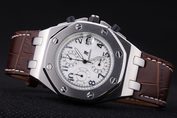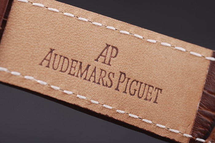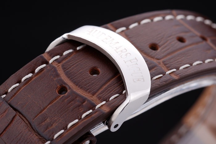Bracelet: bracelet en cuir de crocodile brun foncé avec du blanc surpiq res de fil et de la chaleur en relief nom et le logo Audemars Piguet et une Audemars Piguet inscrit en acier inoxydable flip-dessus le crochet clasp