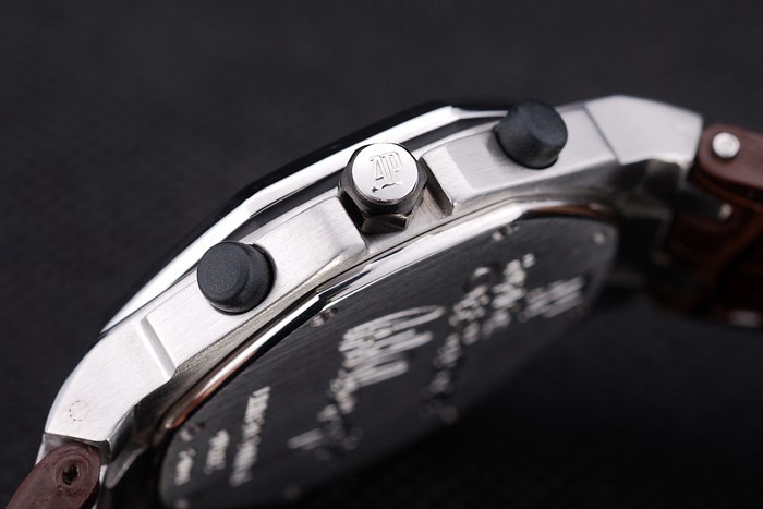 Crown: acier inoxydable Audemars Piguet logo gravé couronne cutwork ion-plaqué avec deux petites couronnes d’ions plaqué de chaque c té de it