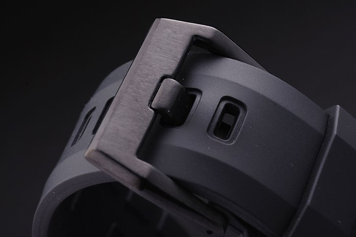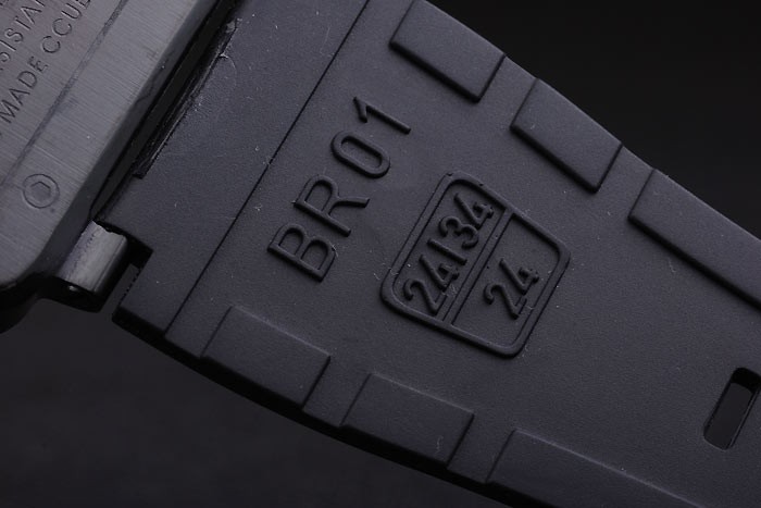 Bracelet en acier ionique plaqué: bracelet en caoutchouc noir avec la chaleur en relief logo, numéro de modèle et produit code et BR gravé ions plaqué crochet boucle déployante