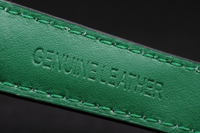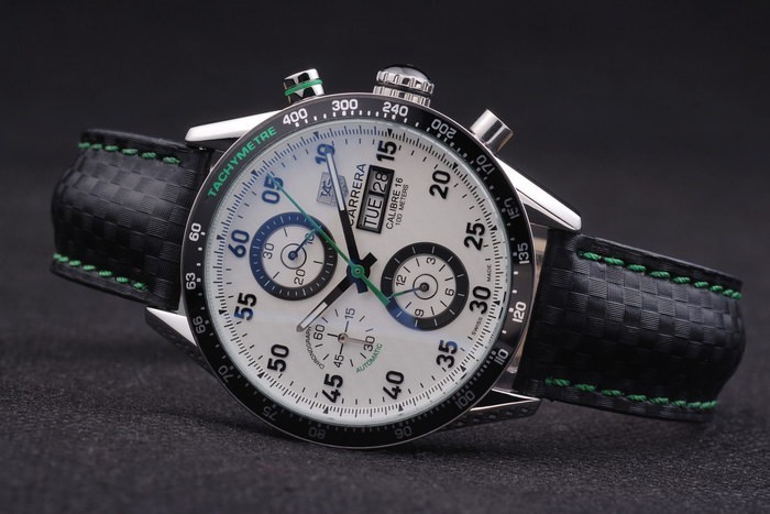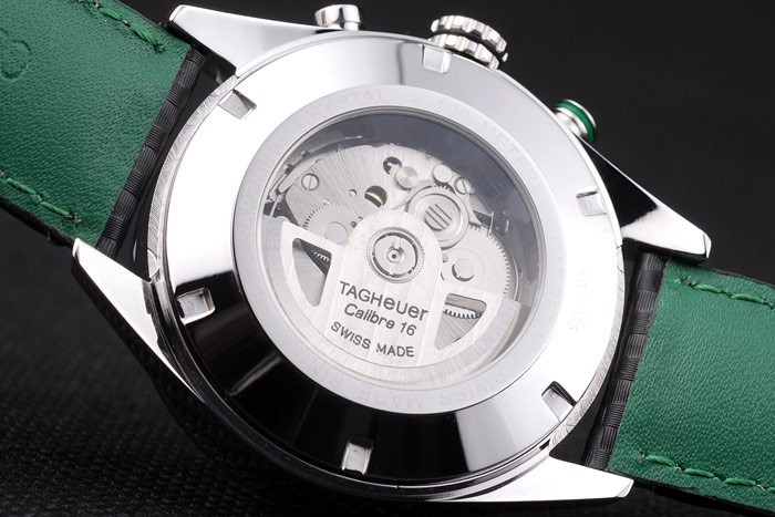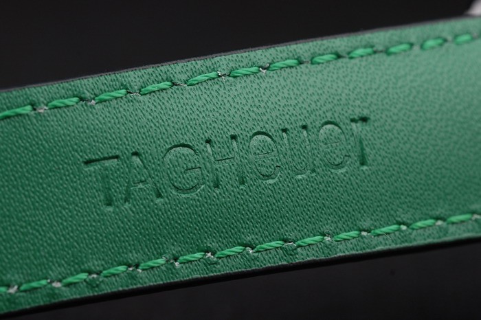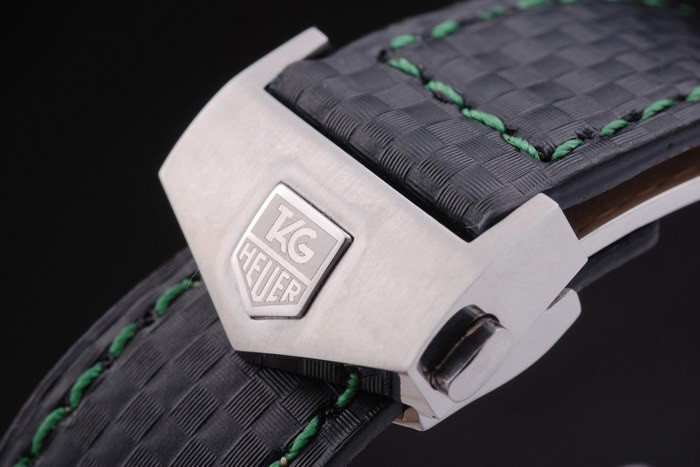 Bracelet en acier inoxydable brossé: bracelet en cuir noir avec coutures de couleur verte et une marque de marquage Heuer et acier inoxydable brossé déploiement clasp
