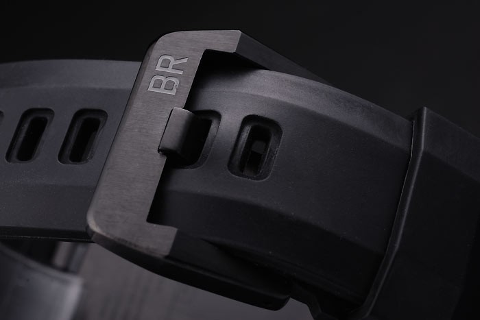 Bracelet en acier: bracelet en caoutchouc noir avec chaleur gaufré logo, numéro de modèle et le code produit et BR gravé ions plaqué crochet boucle déployante