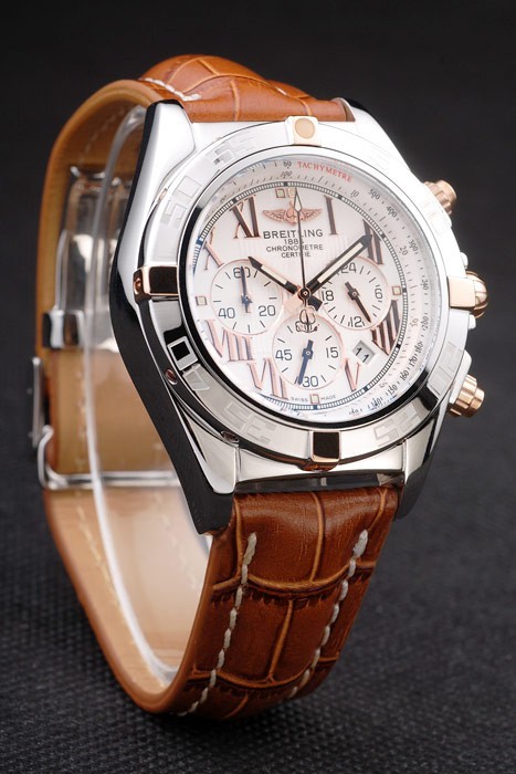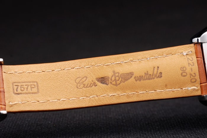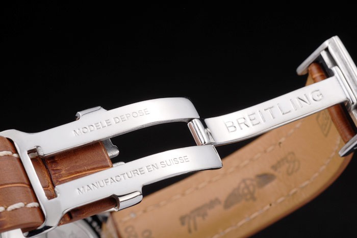 Bracelet en acier inoxydable: Brown bracelet en cuir de crocodile avec brevet coutures blanches et de la chaleur en relief gravures Breitling et en acier inoxydable gravé replient déployante avec logo Breitling sur top