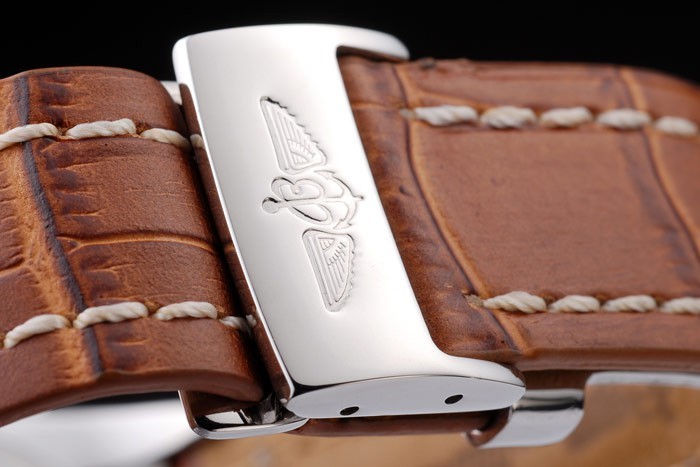 Bracelet en acier inoxydable: Brown bracelet en cuir de crocodile avec brevet coutures blanches et de la chaleur en relief gravures Breitling et en acier inoxydable gravé replient déployante avec logo Breitling sur top