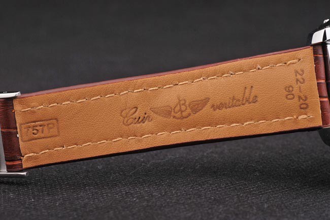 Bracelet inoxydable: acajou chaud en cuir de haute qualité de couleur dans un motif crocodile, avec de lourdes coton blanc coutures. Tan bande intérieure est en relief avec le nom et le logo Breitling, et a une fermeture de boucle en acier.