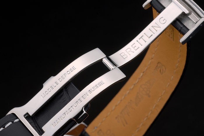 Bracelet en acier inoxydable: Breitling en relief crocodile noir bracelet en cuir de chaleur avec du blanc coutures de fil et logo gravé poli pli en acier inoxydable clasp