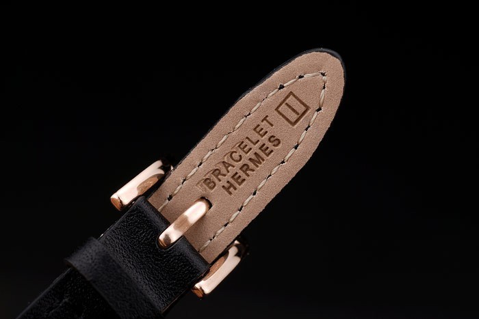Bracelet: allongé bracelet en cuir noir avec le timbre de chaleur en relief et Hermes Hermes Bracelet plaqué gravé or rose crochet boucle fermoir