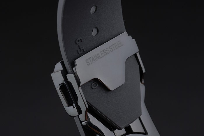 Bracelet en acier inoxydable: chaleur Hublot Geneve en relief nervuré bracelet en caoutchouc noir avec Hublot Geneve gravé ion-plaqué poussoir crochet clasp