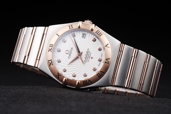Case: acier inoxydable brossé et or rose maillon de cha ne bracelet avec fermoir caché et Omega logo sur top