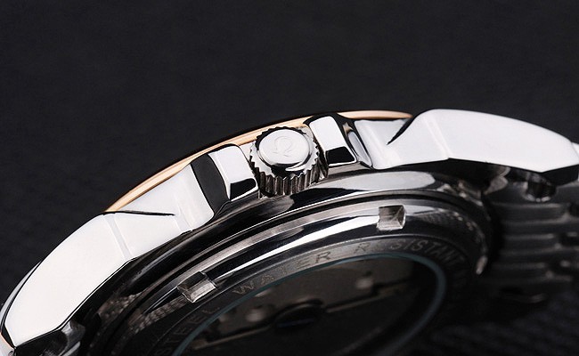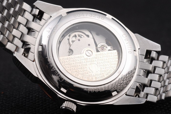 Retour: Acier inoxydable push-en cas de retour avec inscriptions Omega et le centre transparent révèle que la mécanique within
