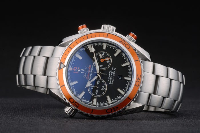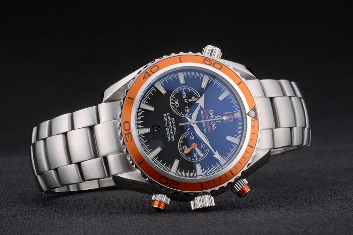 Crown: couronne cutwork en acier inoxydable poli avec Omega logo et une couronne de bouton-poussoir de chaque c té de celui-ci, plus couronne de cutwork sur le c té opposé
