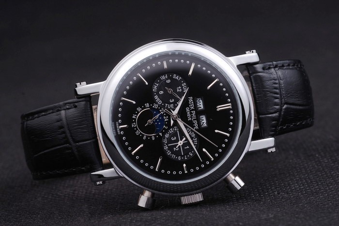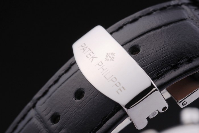 Bracelet en acier inoxydable: bracelet en cuir noir avec Patek Philippe timbre et un pli en acier inoxydable clasp
