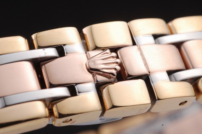 Case japonaise Deux tons bracelet à maillons de fantaisie en or rose 18 plaqué or-acier inoxydable et de l’acier inoxydable poli avec gravure Rolex fermoir caché affichant la longueur Rolex logo
