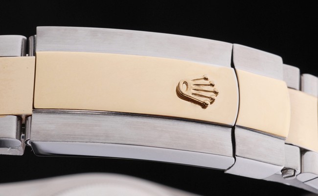 Bracelet en acier: Deux lien tonique bracelet en acier inoxydable brossé et or jaune 18 carats plaqué acier Rolex Gravure dépliante dans le déploiement fermoir affichant la longueur Rolex logo