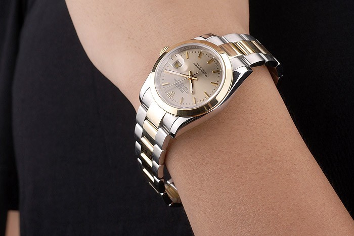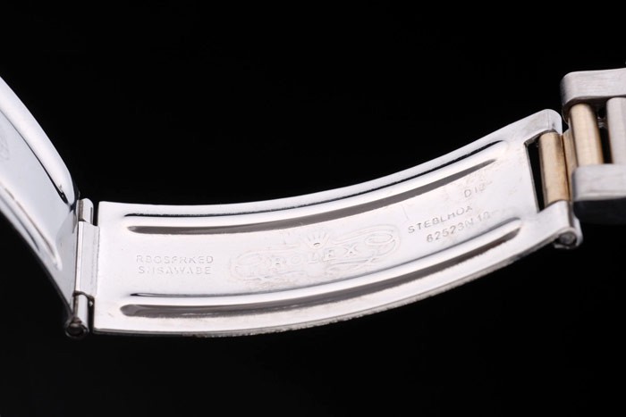 Bracelet en acier: Deux lien tonique bracelet en acier inoxydable brossé et or jaune 18 carats plaqué acier Rolex Gravure dépliante dans le déploiement fermoir affichant la longueur Rolex logo