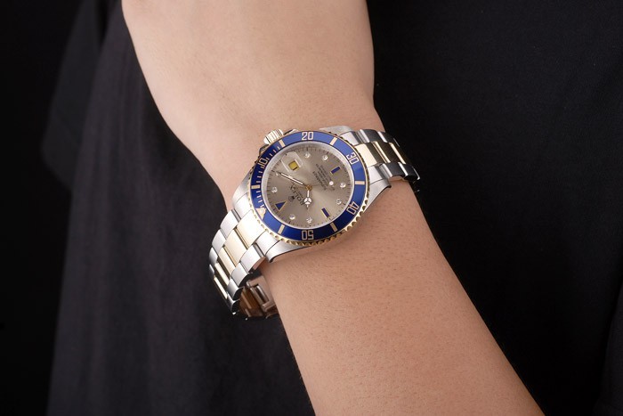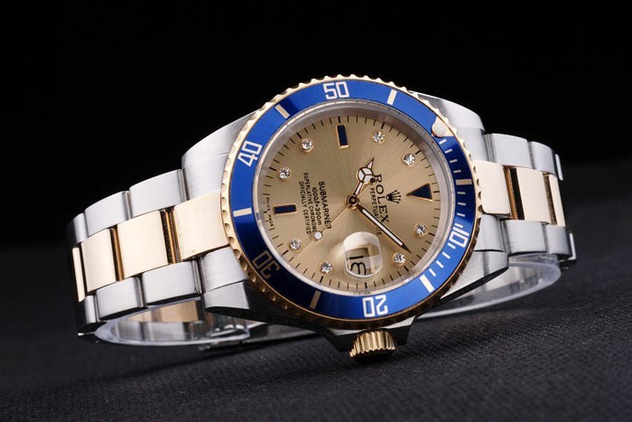 Bezel: gold-tone cutwork lunette avec minutes émaillées bleues lumineuses marquées top