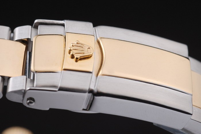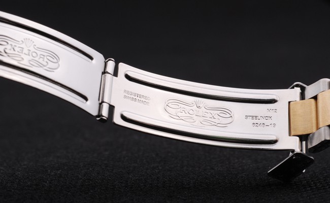 Bracelet: Deux tons ton lien bracelet en acier inoxydable brossé et or avec gravure Rolex plier en boucle affichant la Rolex logo