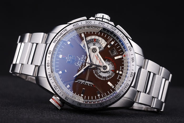 Crown: couronne cutwork en acier inoxydable poli avec Tag Heuer logo et deux rondes couronnes de boutons-poussoirs de chaque c té de it