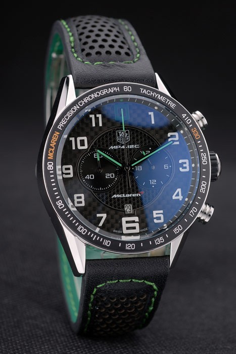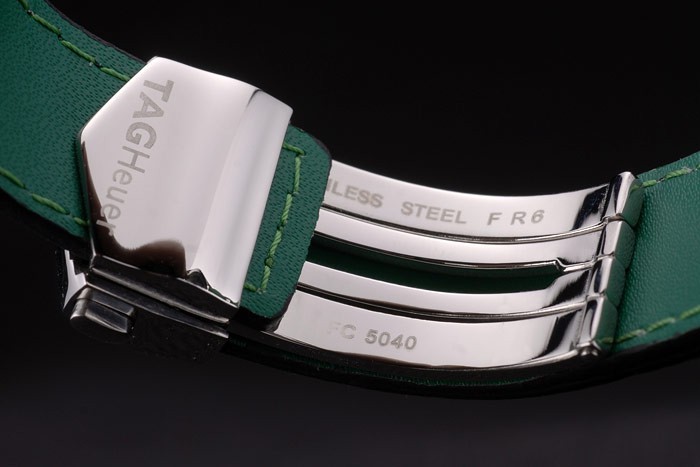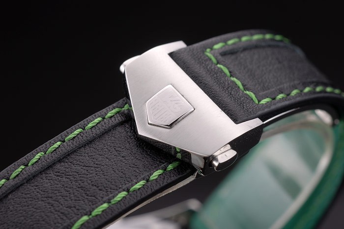 Bracelet en acier inoxydable: Heat gaufré Tag Heuer bracelet en cuir noir avec surpiq res vert et acier inoxydable pli en boucle avec poussoir feature