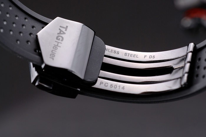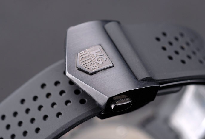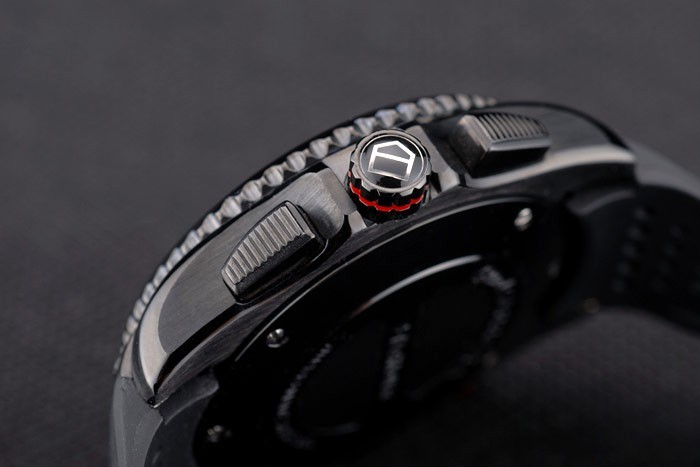 Crown: couronne cutwork en acier inoxydable poli avec émail noir Tag Heuer logo et deux longues cutWork bouton-poussoir couronnes de chaque c té de celui-ci, plus une autre couronne sur la face supérieure corner