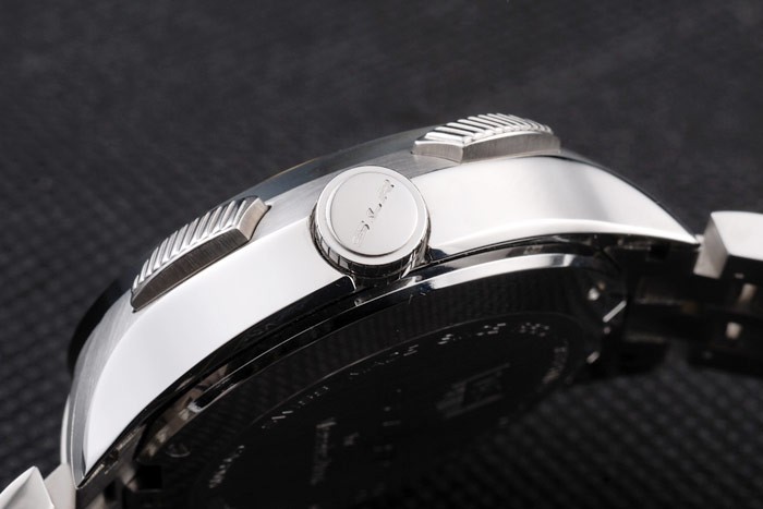 Crown: couronne cutwork en acier inoxydable poli avec deux rectangulaires à bouton-poussoir couronnes de SLR de chaque c té et une grande couronne de cutwork sur le c té opposé avec Tag Heuer logo
