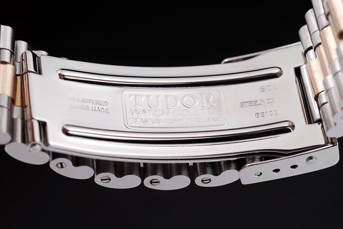 Bracelet: Deux acier inoxydable brossé tonique et plaqué or jaune bracelet lien avec des gravures Tudor et poussoir libération boucle déployante avec logo Tudor sur top