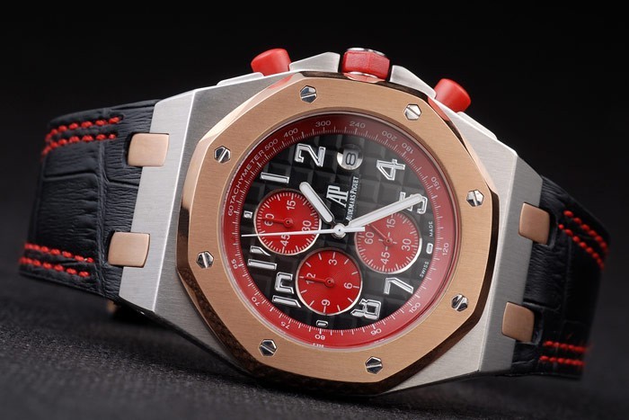 Le bracelet en cuir de crocodile gaufré Audemars Piguet avec fermoir déployant plaqué or rose vient parfaire cet ensemble. Il offre une longueur généreuse de 220 x 25 mm, assurant un confort absolu à votre poignet. La montre est équipée d’une glace en cristal de saphir et d’une couronne hexagonale en caoutchouc rouge ornée des initiales AP, ainsi que de deux couronnes rondes en caoutchouc rouge, témoignant du souci du détail et de l’esthétique. Le fond vissé en acier inoxydable brossé avec le logo Audemars Piguet et ses gravures viennent garantir l’authenticité apparente de cette réplique haut de gamme.