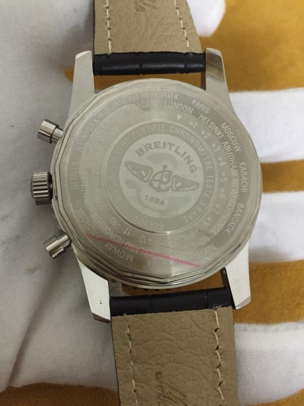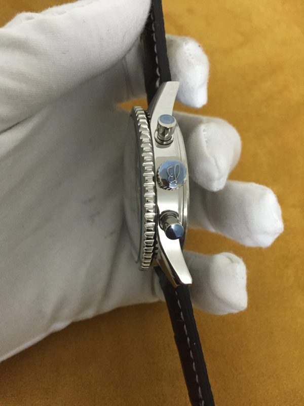 La lunette découpée et polie, équipée d’un tachymètre, ajoute une touche sportive et fonctionnelle à cette montre. En outre, la couronne gravée du logo Breitling, ornée de boutons des deux côtés, assure une manipulation aisée et raffinée. Le bracelet en cuir noir véritable, gaufré crocodile avec des coutures blanches, offre non seulement un confort incomparable, mais également un style qui attire les regards. Avec un diamètre imposant de 54 x 48 mm et une épaisseur de 16 mm, ce modèle se distingue par sa présence au poignet, parfait pour tous ceux qui recherchent une montre au caractère affirmé.